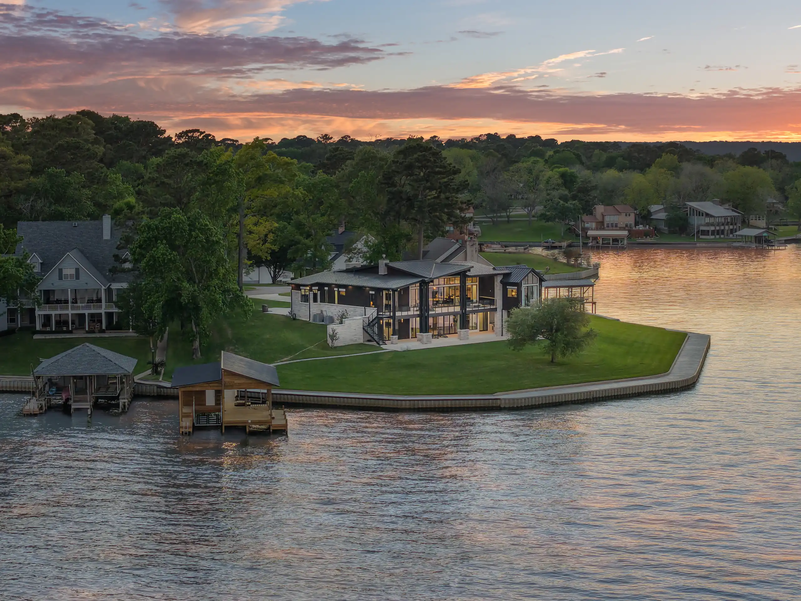 Set on a one-acre peninsula with reinforced steel bulkhead, this custom-built contemporary home offers a truly unmatched lakefront experience. With 270 degree panoramic open water views, the setting alone is extraordinary. The main level showcases a stunning great room with vaulted ceilings, seamless open-concept design and floor-to-ceiling Fleetwood windows to frame the elevated view. The home features two luxurious primary suites, each with spa-like ensuites.